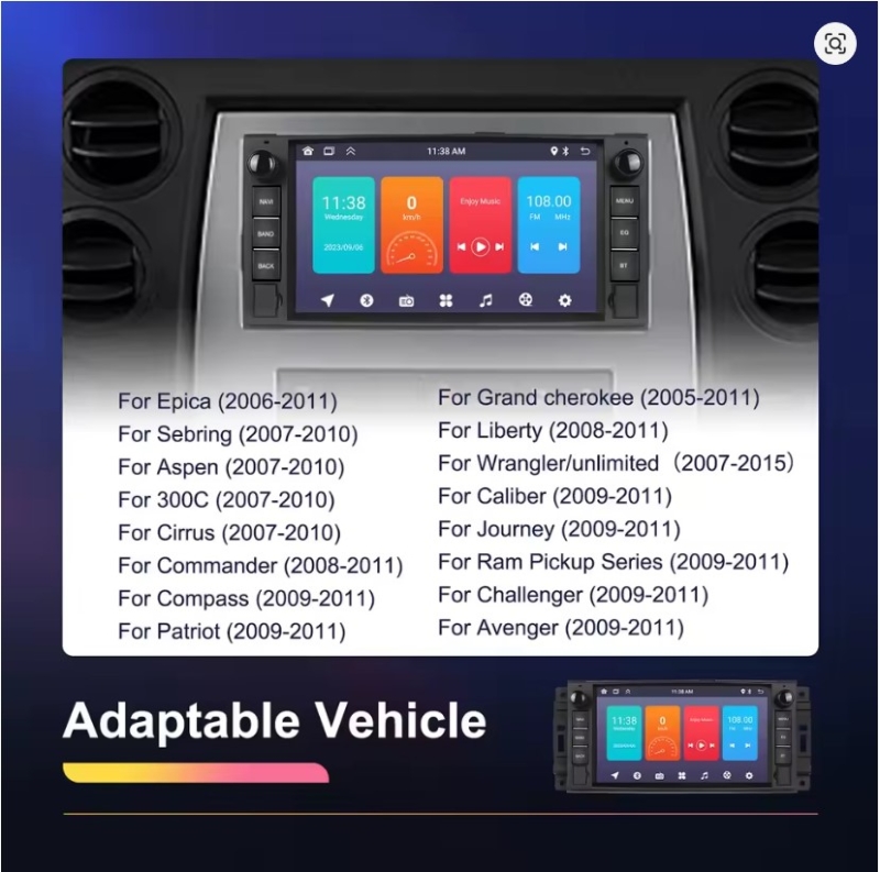 Radio navigatie multimedia met 7inch capacitieve QLED touchscreen voor Chrysler Jeep en Dodge met android 14 besturingssysteem en quadcore processor met 2G ROM en 64GB RAM geheugen. Pasklaar en sluit naadloos aan. Inclusief alle toebehoren en meest recente Europa 3D offline navigatiesoftware reeds geinstalleerd.