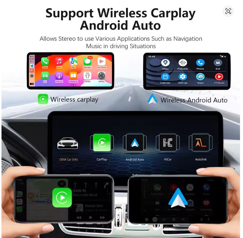 Nu met draadloos Apple Carplay en Android Auto. Apple Carplay en Android Auto zijn op dit moment 1 van de meest gewenste opties. Door het draadloos koppelen van jouw iPhone wordt jouw navigatie systeem een verleng stuk van jouw telefoon. Zo kan je navigeren met Apple Maps, Google Maps, TomTom, Waze, Flitsmeister en nog meer Apps zo kan je zelf kiezen welke navigatie App jij het fijnste vindt.Ook je muziek kiezen wordt gemakkelijk door koppeling met Spotify, Deezer, Tidal, Apple Music, Youtube music en nog meer.Door de ondersteuning van Wireless Apple Carplay hoef je geen kabel aan te sluiten maar is jouw telefoon bij het opstarten van jouw navigatiesysteem gelijk draadloos verbonden. Geef Siri de opdracht om ergens heen te navigeren en je hoeft je handen helemaal niet meer van het stuur af te halen.