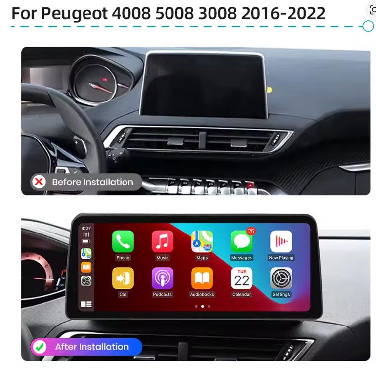 Radio navigatie multimedia met android 15, apple carplay en android auto voor Peugeot 3008 en 5008 met 12,3inch QLED touchscreen en octacore processor 4+64GB geheugen.